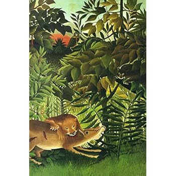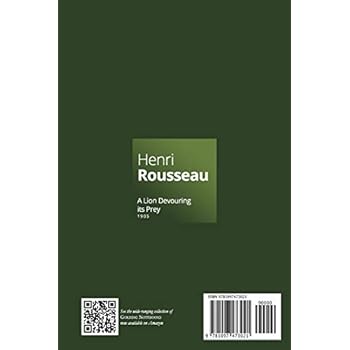 Henri Rousseau painted A Lion Devouring Its Prey (or The Hungry Lion Throws Itself on the Antelope, Le lion ayant faim se jette sur l'antilope in French) in 1905.This was Rousseau’s second jungle painting (after 1904’s Scouts Attacked by a Tiger) following a 10-year hiatus caused by the generally negative reception to his Tiger in a Tropical Storm of 1891.Features of this journal are: 6x9in, 110 pages lined (standard, B&W) on both sides front title and owner’s contact details page cover soft, matteThis elegantly simple journal – which will make wonderful Henri Rousseau prints themed Henri Rousseau gifts for women and men and children – presents a uniquely beautiful work of art from one of the master painters, a distinctive Henri Rousseau notebook (and memorable primitive artwork or naive art presenting Rousseau’s Post-Impressionist style of primitive paintings or naive painting as striking and colourful primitive art prints and naive art prints) that aims to inspire in its owner greater and more imaginative writing.To browse the wide selection of journals from Golding Notebooks, please refer to our Amazon author page.